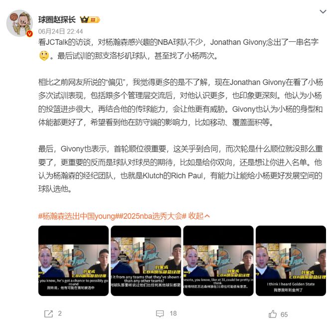 JcTalk的采访,乔纳森-基沃尼透露最后试训杨瀚森的快船队甚至找了小杨两次,多个管理层都杨瀚森的印象很深刻,而且都觉得杨瀚森进步很大。首轮顺位是很重要的,因为这意味着保障性合同,掉到次轮不管是前段还是中段都没有太大意义,球队可能会给双向合同,但我们相信里奇保罗会给杨瀚森更好的发展空间。