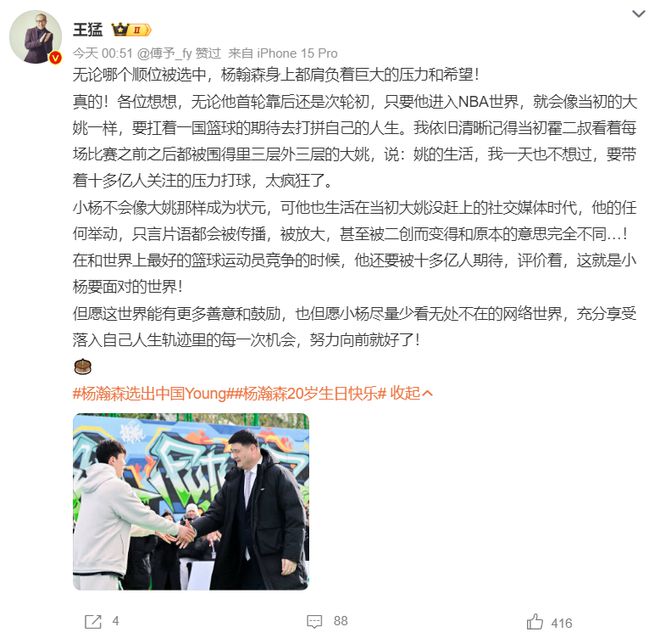 王猛表示:无论哪个顺位选中,杨瀚森身上都肩负重大压力和希望。就像当年的姚明一样,他要扛着一国的篮球期待打拼下去,希望大家多给鼓励和善意。